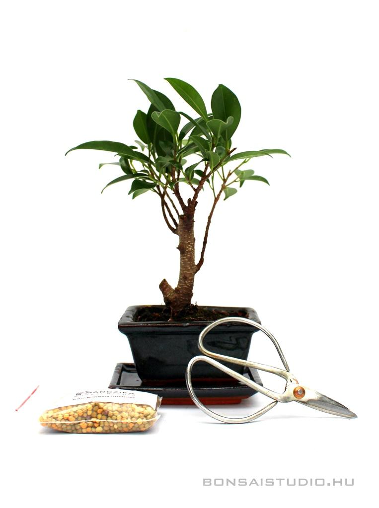 Ha valami különlegeset keres- ajándékozzon szeretteinek bonsait a hozzá tartozó kiegészítőkkel! Az ajándékcsomag tartalmaz egy 10B (10cm-es bonsai tálba ültetett, gömb koronás) Ficus retusa- Fikusz bonsait, a tálhoz tartozó (méretben és színben megegyező) alátétet, egy kis méretű bonsai ollót a bonsai metszéséhez és alakításához, valamint egy kis csomag drazsírozott műtrágyát, mellyel hosszú ideig biztosítható a bonsai tápanyag utánpótlása.