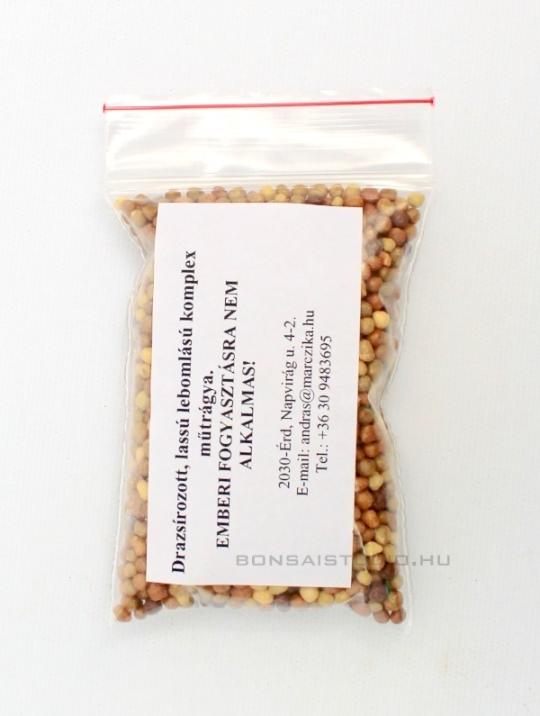 Tartós hatású (lassú lebomlású) műtrágya, melyet a bonsaiok tápanyag utánpótlásához ajánlunk. Az alkalmazandó mennyiség a bonsai, illetve a tál méretével arányosan változik: egy 10cm-es tálba ültetett növény esetén ez 1 csapott mokkáskanálnyi mennyiséget jelent, míg nagyobb tálba ültetett növények esetén a felhasználandó mennyiség a tál méretével arányosan növekszik- pl.: 15cm-es tál esetén 1,5 csapott mokkáskanálnyi, 20cm-es tál esetén 2 csapott mokkáskanálnyi stb.... a szükséges műtrágya mennyisége. A műtrágyát oszlassuk el egyenletesen a bonsai közegének felszínén, majd dolgozzuk bele (nyomkodjuk bele) a közegbe, hogy öntözéskor elkerüljük a tápanyag lemosodását. Lebomlási ideje ≈3-4 hónap.