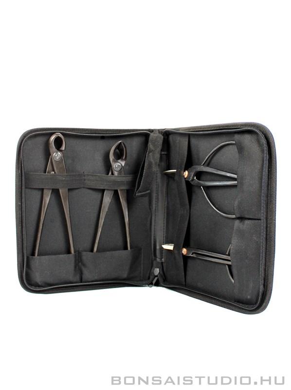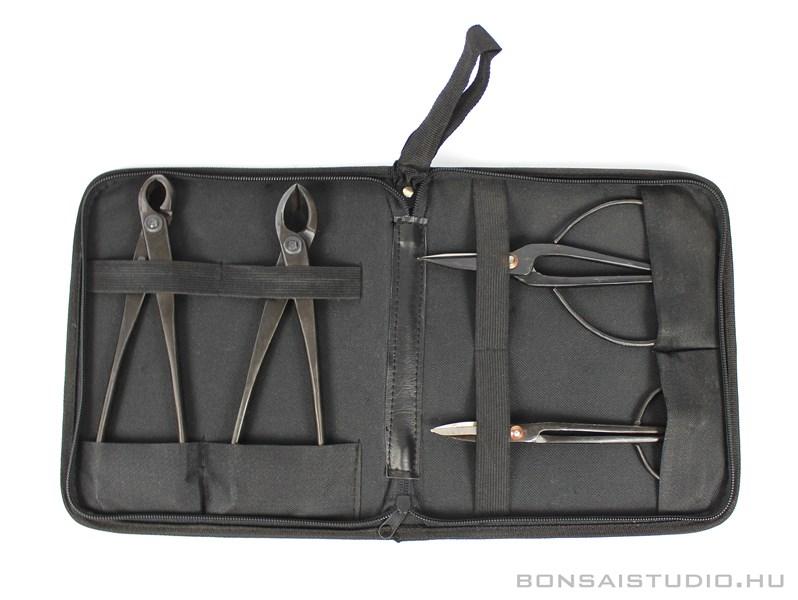 4 db - os bonsai szerszám készlet műbőr tokban. A négy részes bonsai szerszám készlet tartalmaz egy bonsai ollót, egy gyökérmetsző bonsai ollót, egy konkáv bonsai ollót és egy bütyökvágó bonsai ollót. Ezzel a bonsai szerszám készlettel a bonsai tartáshoz szükséges alapvető feladatokat el tudjuk látni. A bonsai ollókkal a bonsai metszését, a bonsai gyökérmetszését illetve levélmetszését láthatjuk el. A konkáv ollóval a nagyobb ágak eltávolítására, alakítására és a vastagabb gyökerek kivágására / eltávolítására vagyunk képesek.